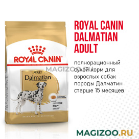 Полнорационный сухой корм для взрослых собак породы Далматин старше 15 месяцев. Повышенное содержание в этом корме фенилаланина и тирозина, необходимых для синтеза пигментов, усиливает яркость окраса пятен. Профилактика заболеваний мочевыводящих путей.
