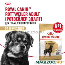 Полнорационный сухой корм для Ротвейлеров старше 18 месяцев. Оптимальное содержание белков и точно подобранная пропорция L-карнитина в составе данного корма обеспечивают гармоничное развитие мышечной массы ротвейлера. Форма крокет, подобранная с учетом строения челюстей ротвейлера, стимулирует собаку к разгрызанию корма.