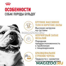 Полнорационный сухой корм для взрослых собак породы Бульдог, старше 12 месяцев. Корм поддерживает защитные функции кожного барьера и природную красоту шерсти бульдога. Способствует гармоничному развитию суставов в период формирования опорно-двигательного аппарата, помогая, среди прочего, предотвратить избыточный вес.