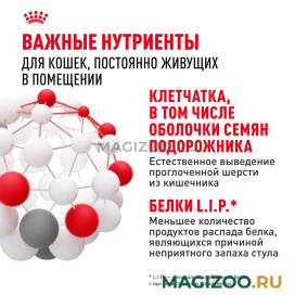 Благодаря присутствию в составе корма ROYAL CANIN® Indoor 27 нескольких видов пищевой клетчатки, в частности семян подорожника, облегчается выведение из пищеварительного тракта проглоченной шерсти и снижается вероятность образования волосяных комочков.