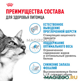 Благодаря присутствию в составе корма ROYAL CANIN® Indoor 27 нескольких видов пищевой клетчатки, в частности семян подорожника, облегчается выведение из пищеварительного тракта проглоченной шерсти и снижается вероятность образования волосяных комочков.