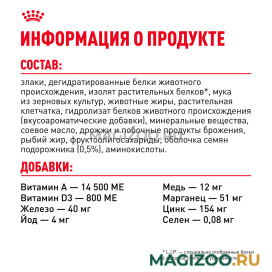 Информация о составе и ингредиентах, цветовом решении, технических и иных характеристиках, стране-изготовителе, внешнем виде и комплекте поставки товара носит справочный характер и основана на последних доступных к моменту публикации сведениях. Доставка данного товара осуществляется во все регионы РФ.Развитие ROYAL CANIN всегда обусловлено научными исследованиями. В ROYAL CANIN работает команда профессионалов – ветеринарных врачей и специалистов в области питания