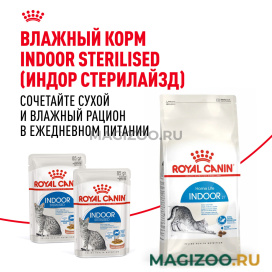Для удовлетворения индивидуальных предпочтений каждого питомца к рациону ROYAL CANIN® Indoor 27 Вы можете подобрать влажный рацион в виде кусочков в соусе или других текстур.