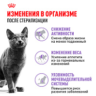 Полнорационный сухой корм для кастрированных котов и стерилизованных кошек от 1 до 7 лет. После стерилизации (кастрации) поведение кошек меняется, и их питание должно соответствовать новым специфическим потребностям. Дело в том, что эти кошки не отличаются высокой активностью, потребляют меньше жидкости и, соответственно, у них реже частота мочеиспусканий и повышена концентрация мочи.