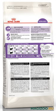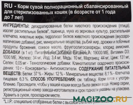 Полнорационный сухой корм для кастрированных котов и стерилизованных кошек от 1 до 7 лет. После стерилизации (кастрации) поведение кошек меняется, и их питание должно соответствовать новым специфическим потребностям. Дело в том, что эти кошки не отличаются высокой активностью, потребляют меньше жидкости и, соответственно, у них реже частота мочеиспусканий и повышена концентрация мочи.