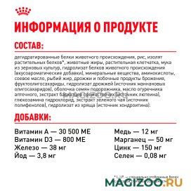 Дегидратированные белки животного происхождения, рис, изолят растительных белков*, животные жиры, растительная клетчатка, мука из зерновых культур, гидролизат белков животного происхождения (вкусоароматические добавки), минеральные вещества, аминокислоты, соевое масло, рыбий жир, дрожжи и побочные продукты брожения, фруктоолигосахариды, гидролизат дрожжей (источник мaннановых олигосахаридов), оболочка семян подорожника, масло огуречника аптечного, экстракт бархатцев прямостоячих (источник лютеина), глюкозамина гидрохлорид, экстракт зеленого чая (источник полифенолов), гидролизат из хряща (источник хондроитина).