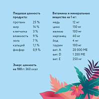 Пищевые добавки: витамин А: 31080 me, витамин D3: 830 me, железо: 32 мг, йод: 3,2 мг, медь: 10 мг, марганец: 42 мг, цинк: 126 мг, селен: 0,1 мг, консерванты - антиокислители.