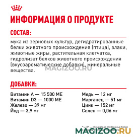 Мука из зерновых культур, дегидратированные белки животного происхождения (птица), злаки, животные жиры, растительная клетчатка, гидролизат белков животного происхождения (вкусоароматические добавки), минеральные вещества.