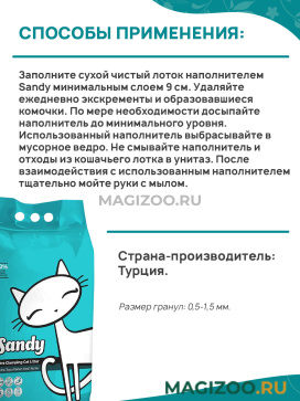 Заполните сухой чистый лоток наполнителем Sandy минимальным слоем 9 см. Удаляйте ежедневно экскременты и образовавшиеся комочки. По мере необходимости досыпайте наполнитель до минимального уровня. Использованный наполнитель выбрасывайте в мусорное ведро. Не смывайте наполнитель и отходы из кошачьего лотка в унитаз. После взаимодействия с использованным наполнителем тщательно мойте руки с мылом.