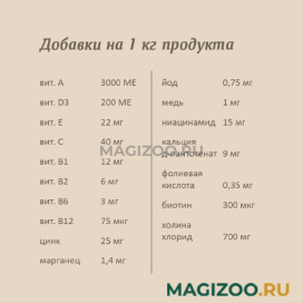 Витамин А — 3000 МЕ, витамин D3 — 200 МЕ, витамин E — 22 мг, витамин С — 40 мг, витамин В1 — 12 мг, витамин В2 — 6 мг, витамин В6 — 3 мг, витамин В12 — 75 мкг, ниацинамид — 15 мг, кальция д-пантотенат — 9 мг, фолиевая кислота — 0,35 мг, биотин — 300 мкг, холина хлорид — 700 мг, цинк — 25 мг, марганец — 1,4 мг, йод — 0,75 мг, медь — 1 мг.