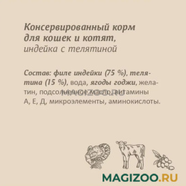 Полнорационный сбалансированный беззерновой влажный корм для кошек и котят с 3-х месяцев с индейкой и телятиной.