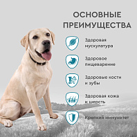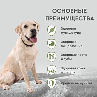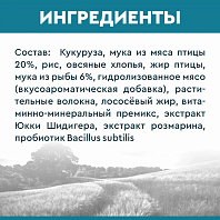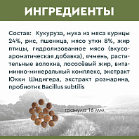 Мука из мяса курицы 32 %, кукуруза, пшеница, жир птицы, ячмень, гидролизованные мясные белки (вкусоароматическая добавка), пивные дрожжи, лососевый жир, витаминно-минеральный премикс, экстракт Юкки Шидигера, экстракт розмарина, пробиотик Bacillus subtilis.