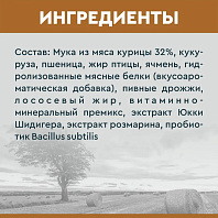Кукуруза, мука из мяса курицы 20%, рис, овсяные хлопья, жир птицы, мука из рыбы 6%, гидролизованные мясные белки, растительные волокна, лососевый жир, витаминно-минеральный премикс, экстракт Юкки Шидигера, экстракт розмарина, пробиотик Bacillus subtilis.