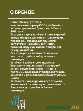Торговая марка Yami-Yami - это широкий выбор товаров для животных: лежаки, переноски, товары для груминга, когтеточки и домики, амуниция, лоточки, игрушки, миски, товары для грызунов и птиц.