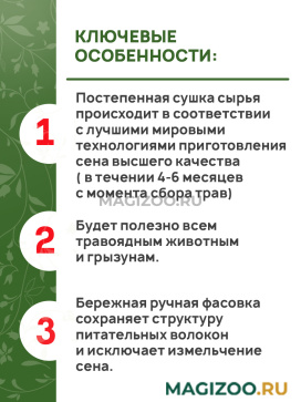 - Бережная ручная фасовка сохраняет структуру питательных волокон и исключает измельчение сена.