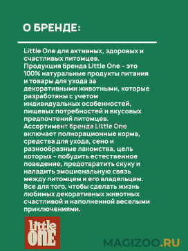 Ассортимент бренда Little One включает полнорационные корма, средства для ухода, сено и разнообразные лакомства, цель которых – побудить естественное поведение, предотвратить скуку и наладить эмоциональную связь между питомцем и его владельцем.