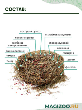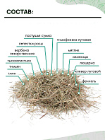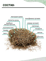 Сено многолетних трав второго укоса: тимофеевка луговая, одуванчик лекарственный, смолёвка обыкновенная, овсяница луговая, мятлик однолетний, райграс многолетний, пастушья сумка обыкновенная, тысячелистник обыкновенный, подорожник, крапива двудомная, мальва лесная, тимьян, душистый колосок обыкновенный, вербена лекарственная, канареечник красный, клевер луговой, клевер ползучий, люцерна посевная, лисохвост луговой, бермудская трава, ежа сборная, таволга обыкновенная, бухарник шерстистый, амброзия полыннолистная, луговик дернистый, подорожник ланцетолистный, тмин обыкновенный, купырь лесной, горошек заборный̆, маргаритка многолетняя, цикорий обыкновенный, лопух большой, фенхель. Лепестки розы.