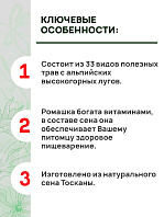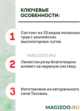 - Изготовлено из натурального сена Тосканы. Луга этой итальянской провинции богаты одуванчиками, клевером, подорожником, эспарцетом. Эти ценные травы содержат минеральные вещества, в том числе, кварц и кремний.