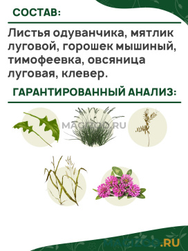 Листья одуванчика, мятлик луговой, горошек мышиный, тимофеевка, овсяница луговая, клевер.