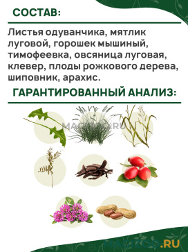 Листья одуванчика, мятлик луговой, горошек мышиный, тимофеевка, овсяница луговая, клевер, плоды рожкового дерева, шиповник, арахис.