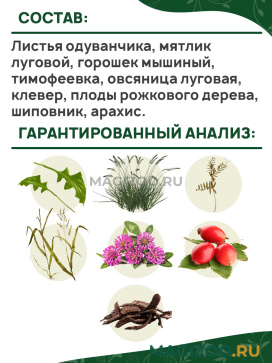 Листья одуванчика, мятлик луговой, горошек мышиный, тимофеевка, овсяница луговая, клевер, плоды рожкового дерева, шиповник, арахис.