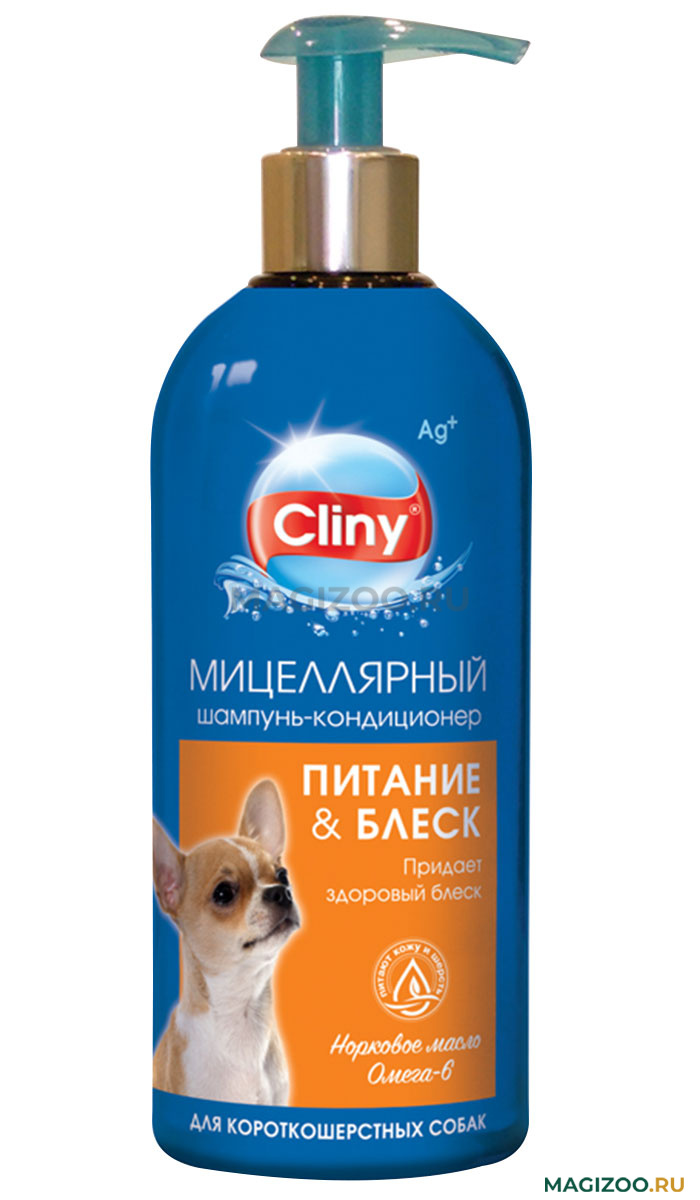 Cliny шампунь кондиционер для короткошерстных собак питает и укрепляет кожно-волосяной покров, придает здоровый блеск и упругость.