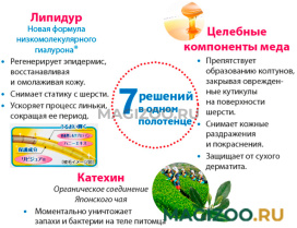 - Катехин (органическое соединение японского чая) моментально уничтожает неприятные запахи и бактерии на шерсти и коже питомца.