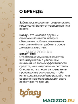 • Эффективность для питомца, эстетичность для владельца. Bonsy предусмотрели современные оттенки для линейки аксессуаров, сделали удобные и эргономичные флаконы, а так же разработали приятные ароматы для серии косметических товаров, запахи которых не вредят острому обонянию животных.