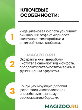 Шампунь идеально под¬ходит для ежедневного применения после кормления, легко удаляет жир и остатки пищи с волос и кожи. Частое использование шампуня предотвращает развитие грибковых заболеваний, смягчает эпидермис, снимает зуд, восстанавливает и укрепляет шерсть, способствует легкому расчесыванию.
