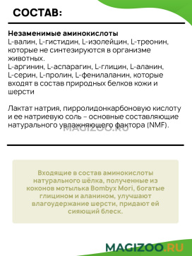 ELITE PROFESSIONAL содержит комплекс 14 аминокислот из Японии, а также дополнительные активные ингредиенты. Аминокислоты являются элементами структуры волоса. Они увлажняют кожу и шерсть, стимулируют рост волос, обеспечивают защиту цвета и текстуры, устраняют поверхностные повреждения волоса, придают шерсти прочность и здоровый блеск.