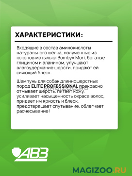Шампунь для собак длинношерстных пород ELITE PROFESSIONAL прекрасно отмывает шерсть, питает кожу, усиливает насыщенность окраса волос, придает им яркость и блеск, предотвращает спутывание, облегчает расчесывание!