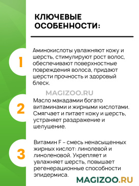 - Масло макадамии богато витаминами и жирными кислотами. Смягчает и питает кожу и шерсть, устраняет раздражение и шелушение.