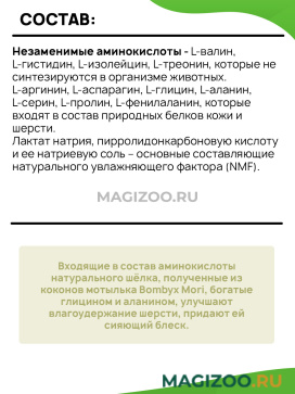 - Аминокислоты увлажняют кожу и шерсть, стимулируют рост волос, обеспечивают поверхностные повреждения волоса, придают шерсти прочность и здоровый блеск.