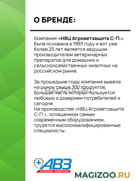 Высокий профессионализм, использование передовых технологий и бесценный опыт позволяют компании АВЗ производить эффективные, безопасные и доступные лекарства для животных.