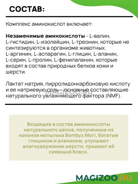 Входящие в состав природные компоненты (экстракт зеленого чая, мяты перечной, водяного кресса, белой крапивы, корня лопуха, розмарина, иголок сосны, чеснока, ромашки, плюща, арники) снимают зуд и стимулируют рост шерсти. Аллантоин, обладая увлажняющим, смягчающим и одновременно противовоспалительным действием, облегчает расчесывание и предотвращает спутывание шерсти.