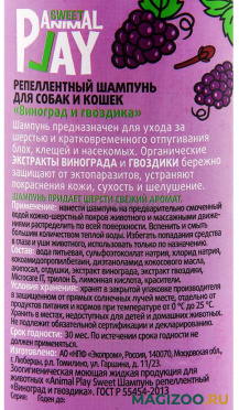 ANIMAL PLAY SWEET Виноград и гвоздика — репеллентный шампунь для собак и кошек объемом 300 мл, созданный для эффективной защиты вашего питомца от блох и клещей.