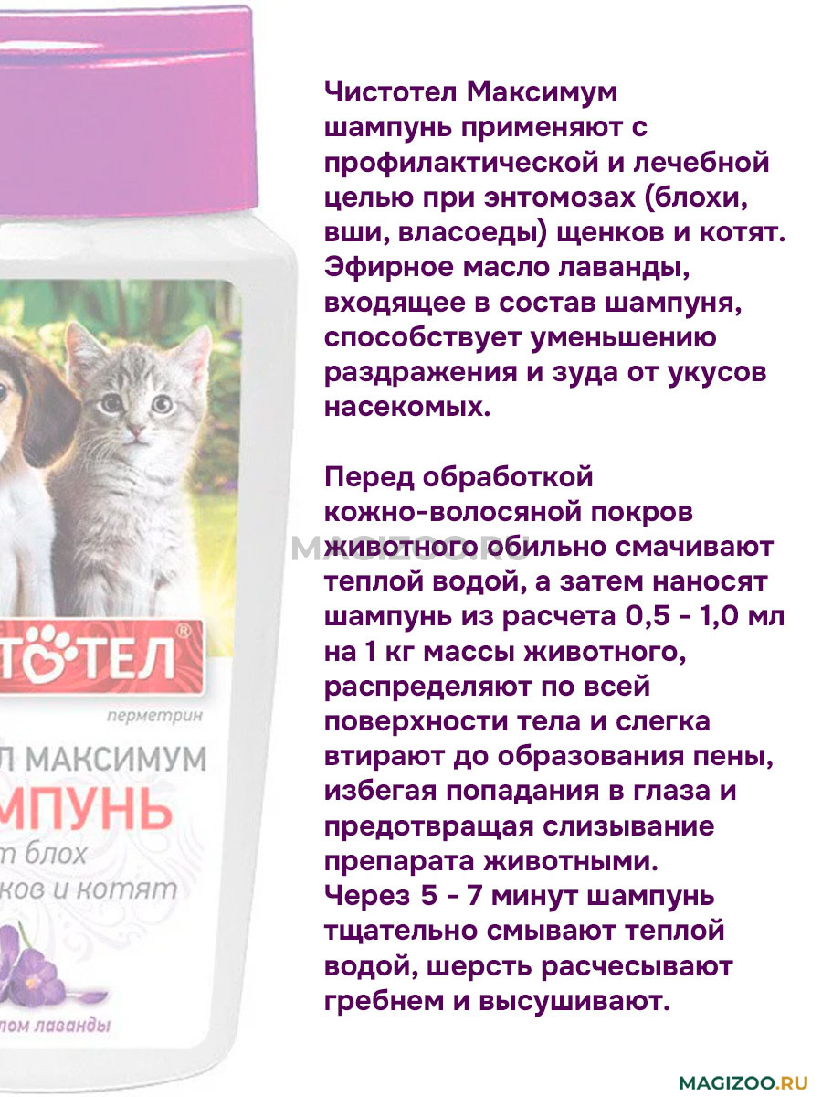 Чистотел Максимум шампунь применяют с профилактической и лечебной целью при энтомозах (блохи, вши, власоеды) щенков и котят. Эфирное масло лаванды, входящее в состав шампуня, способствует уменьшению раздражения и зуда от укусов насекомых.