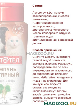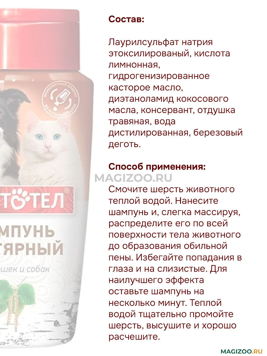 Шампунь с натуральным березовым дегтем. Избавляет от блох, вшей и власоедов. Снимает зуд и раздражение.