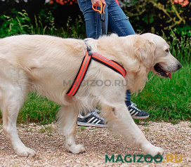 Эргономичная шлейка с мягким наполнением, ярким дизайном и светоотражающими вставками для собак крупных пород весом до 30 кг идеально подходит для прогулок в темное время суток.