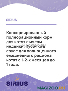 Корм Sirius (Сириус) для собак и кошек выпускается отечественным брендом. Российская компания «Лимкорм-Петфуд» предлагает широкую линейку кормов с разнообразными вкусами.