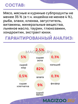Мясо, мясные и куриные субпродукты не менее 35 % (в т.ч. индейка не менее 4 %), рыба, злаки, клюква, загуститель, витамины, минеральные вещества, льняное масло, таурин, глюкозамин, хондроитин, экстракт юкки.