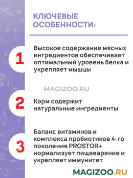 - Также содержит все необходимые микроэлементы и витамины для здорового роста и развития питомца.