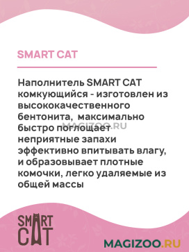 Наполнитель SMART CAT комкующийся - изготовлен из высококачественного бентонита, максимально быстро поглощает неприятные запахи эффективно впитывать влагу, и образовывает плотные комочки, легко удаляемые из общей массы.