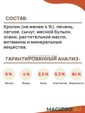 Кролик (не менее 4 %), печень, легкое, сычуг, мясной бульон, злаки, растительное масло, витамины и минеральные вещества.