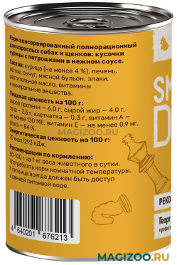 Консервы высочайшего качества для собак всех пород с кусочками курицы и потрошками в нежном соусе.