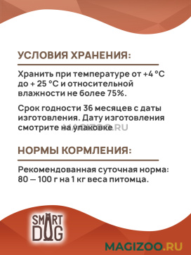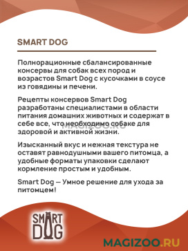 Рецепты консервов Smart Dog разработаны специалистами в области питания домашних животных и содержат в себе все, что необходимо собаке для здоровой и активной жизни.