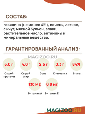 Состав: говядина (не менее 4%), печень, легкое, сычуг, мясной бульон, злаки, растительное масло, витамины и минеральные вещества.
