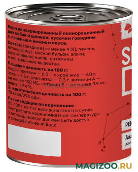 Полнорационные сбалансированные консервы для собак всех пород и возрастов Smart Dog с кусочками в соусе из говядины и печени.