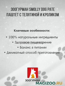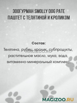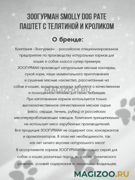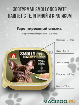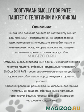SMOLLY DOG PATE - серия высококачественных натуральных кормов для собак мелких пород, живущих в городских условиях. Сбалансированный рацион мясных ингредиентов, белков и питательных веществ, обогащённых витаминами, гарантирует Вашему питомцу здоровье и хорошее настроение каждый день!