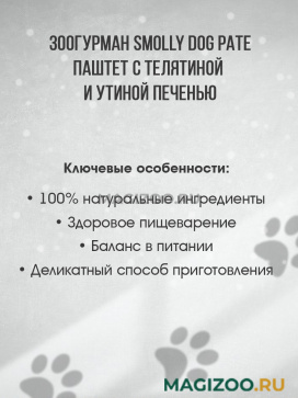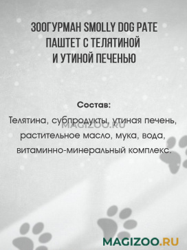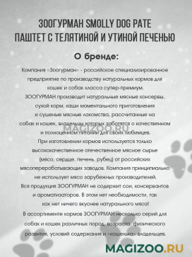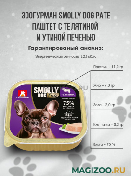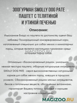 SMOLLY DOG PATE - серия высококачественных натуральных кормов для собак мелких пород, живущих в городских условиях. Сбалансированный рацион мясных ингредиентов, белков и питательных веществ, обогащённых витаминами, гарантирует Вашему питомцу здоровье и хорошее настроение каждый день!